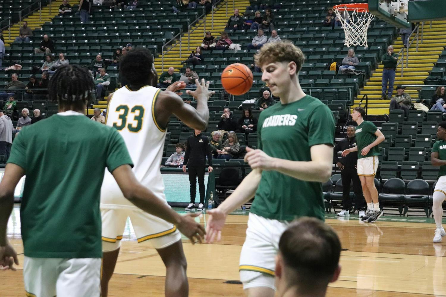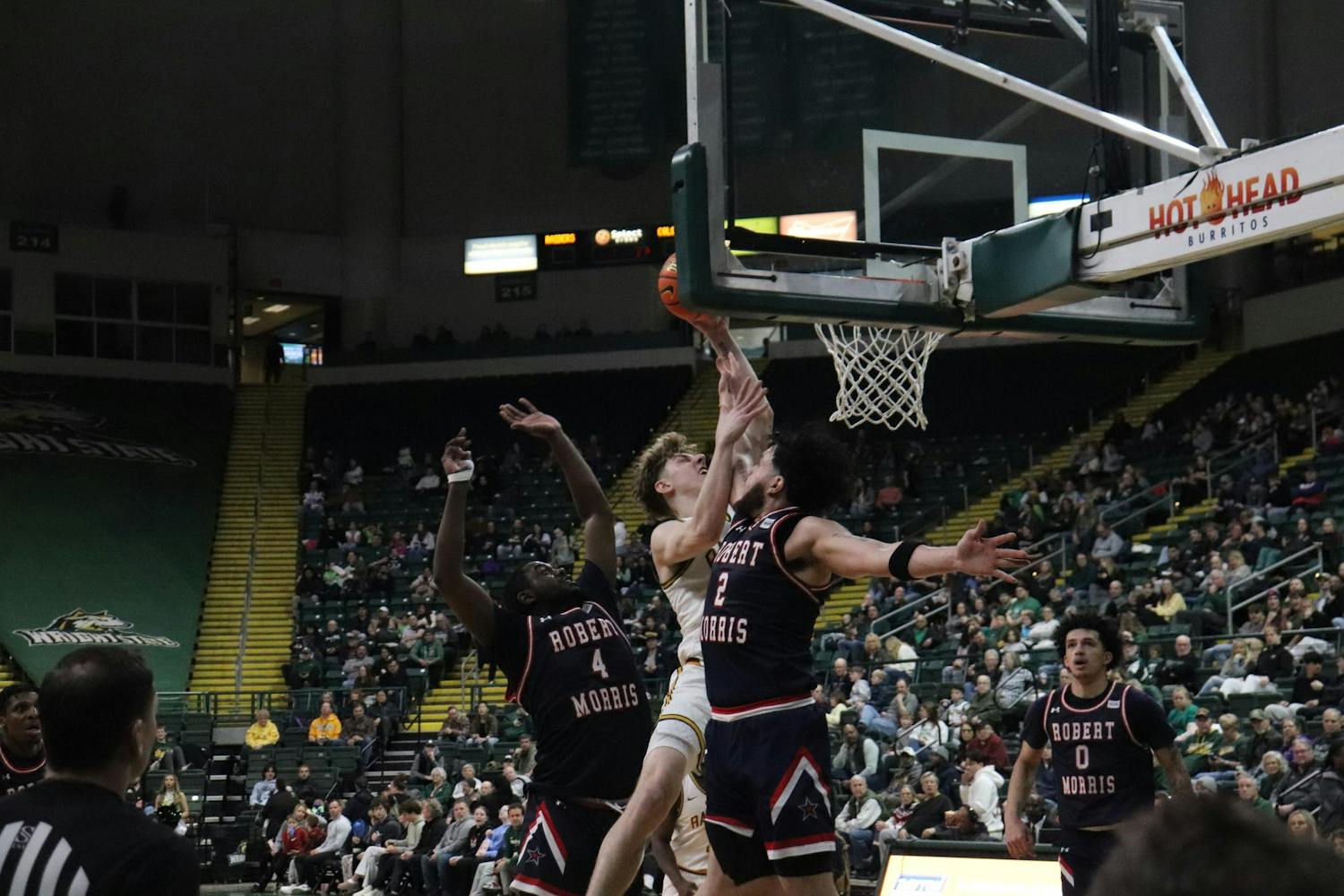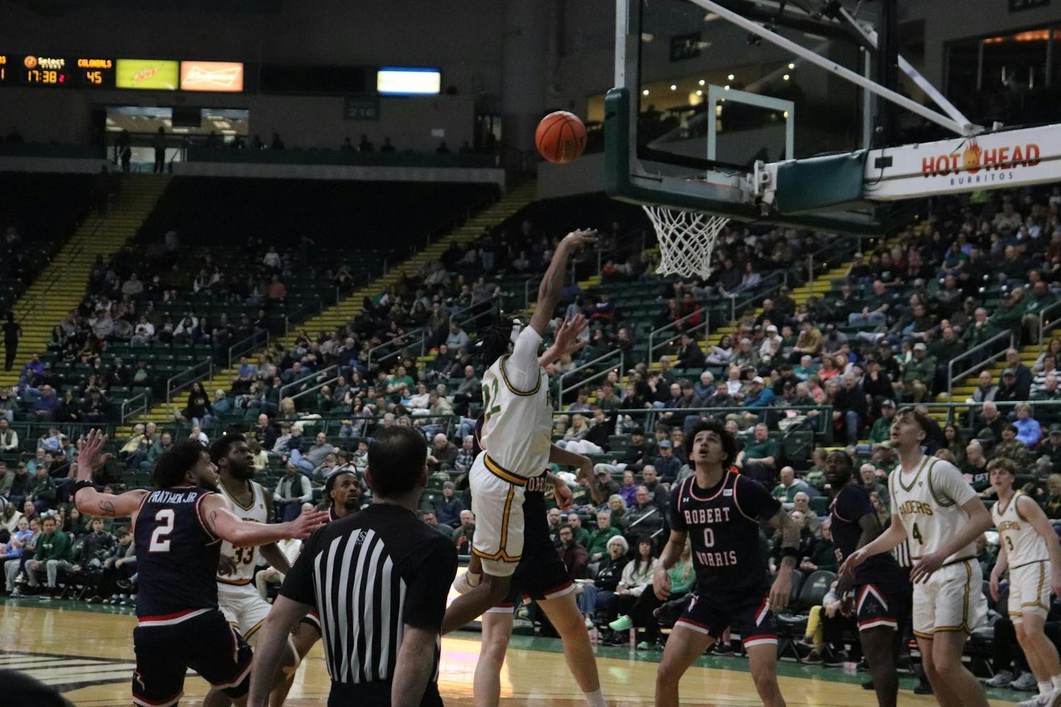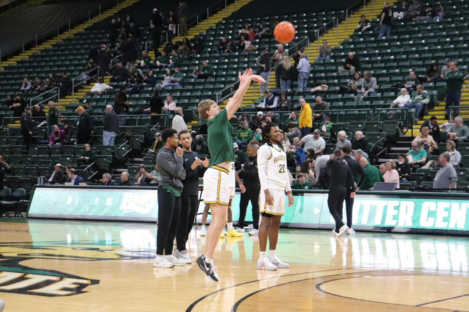 The Raiders, who were never able to take the lead, lost the game with an unfortunate outcome of the RMU men’s team storming the court for the ESPNU post-game interview and the final score of 81-68 RMU. The game, despite the loss, was full of emotion and fouls on both ends.